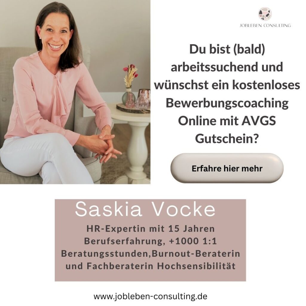 Als Beraterin für berufliche Neuorientierung von hochsensiblen Fach- und Führungskräften kannst du kostenfrei von mir beraten werden, wenn du (bald) arbeitssuchend bist. Es geht in meiner Beratung um folgende Themen, die ich individuell auf dich anpasse: Wie finde ich einen Job, der sinnvoll ist und mich erfüllt? Was sind meine Stärken? Wie schaffe ich einen Wiedereinstieg nach einem Burnout? Wie kann ich aus meiner Hochsensibilität Energie ziehen anstatt ausgelaugt zu werden? Wie bereite ich mich als hochsensible Person souverän auf Bewerbungsgespräche vor? Klicke einfach auf das Bild und erfahre mehr. Ich freue mich darauf, dich im Rahmen einer kurzen Video-Session unverbindlich kennenzulernen.