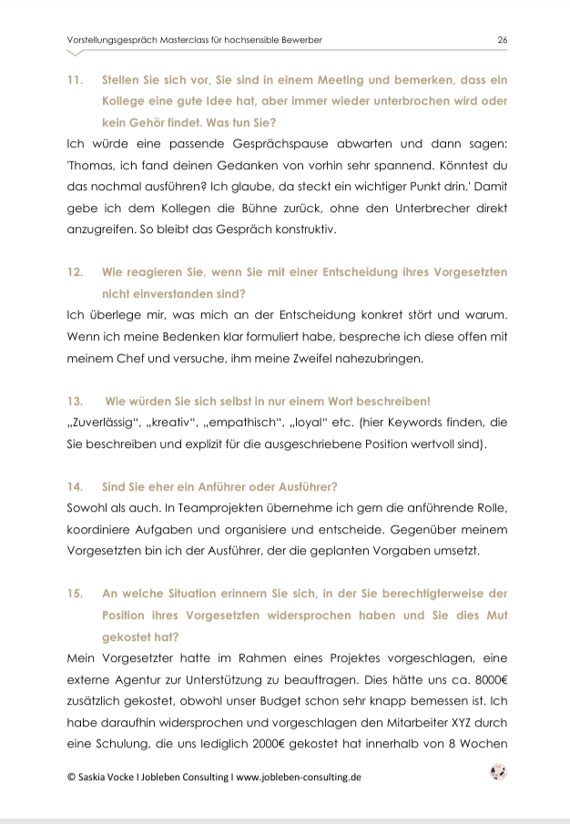 Du gehst mit einer inneren Ruhe in das Vorstellungsgespräch, weil du auf kritische Fragen und „Lücken im Lebenslauf“ souveräne und ehrliche Antworten vorbereitet hast.